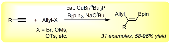 31. Jing, H.; Feng, X.; Guo, M.; Zhou, S.; Li, Y.; Zhang, J.; Zhao, W.;* Tang, X.; Wang, G.* Copper-catalyzed regioselective formal allylboration of arylsubstituted terminal alkynes with bis(pinacolato)diboron and allyl halides/sulfonates.Asian J. Org. Chem. 2017,6, 1375-1379. DOI: 10.1002/ajoc.201700263