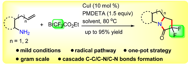 37. Wang, X.; Li, M.; Yang, Y.; Guo, M.;* Tang, X.; Wang, G.* One-pot Construction of Difluorinated Pyrrolizidine and Indolizidine Scaffolds via Copper-Catalyzed Radical Cascade Annulation.Adv. Synth. Cat. 2018,360, 2151-2156. DOI: 10.1002/adsc.201701643