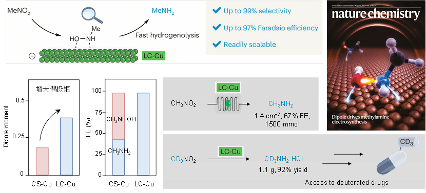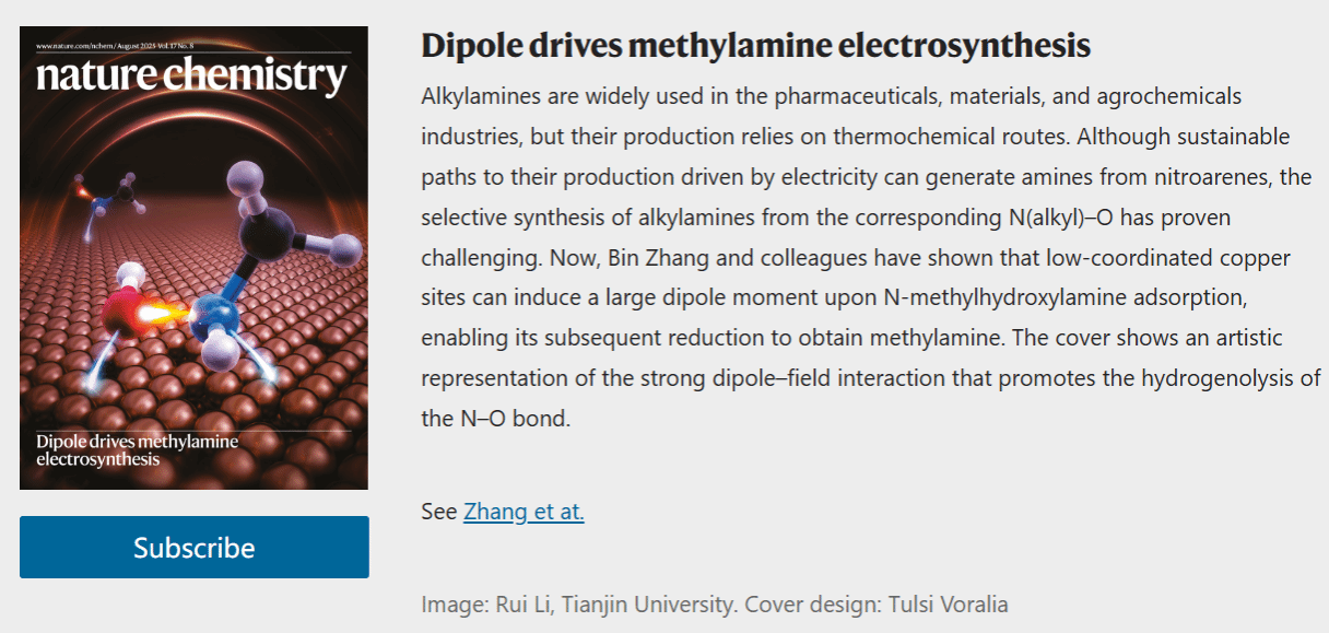 Rui Li, Rong Yang, Qian Li, Mengmei Qin, Meng He, Cuibo Liu, Bin Zhang*. Strong dipole-promoted N–O bond hydrogenolysis enables ampere-level electrosynthesis of methylamine. Nature Chemistry 2025, 17(8), 115−1160. (Cover)