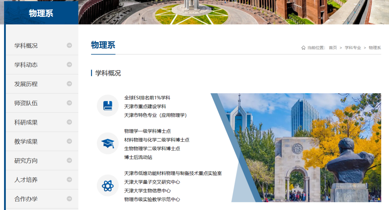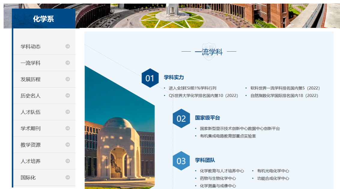 新官网还设置了化学、物理学学科的综合页面,从发展历程、人才队伍、学科动态、教学科研成果等方面进行了综合介绍。