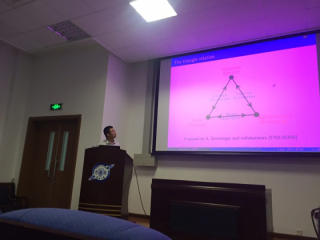 刘正文首先介绍了散射振幅的重要性和CHY公式这一振幅领域的新进展,展示了CHY公式中包括的主要内容,展示了CHY公式如何在任意维数时空中给出很多种理论的。接着刘正文同学介绍了他自己的一些相关工做,包括在四维对若干理论利用Weyl旋量给出的CHY公式以及由此得到的一些双软极限定理,关于一些形状因子的CHY公式和在一些特殊运动学极限下由CHY公式得到的结果。 毛普健博士于兰州大学获得硕士学位,2016年于比利时布鲁塞尔自由大学获得博士学位,现在在中国科学院做博士后,他在引力领域做出了很好的工作。毛普健博士在报告中首先介绍了哈佛大学Strominger教授发现的振幅软定理、渐近对称性、记忆效应之间三角等价关系。然后介绍了她在这一方向上自己的工作:包括利用渐近守恒荷的渐近展开给出量子电动力学、杨-Mills理论的次领头阶软定理、引力理论的次次领头阶软定理;在量子电动力学中给出了新的记忆效应和在更高的偶数维时空的标量理论讨论了这一三角等价关系。