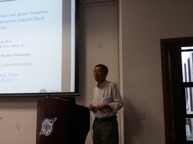 赵柳老师在报告中首先介绍了共形引力这一特殊的高阶导数引力, 然后介绍了他和学生对吕宏老师等发现的一个黑洞解的热力学的仔细分析。最后他介绍了相关的C度规的工作。缪炎刚老师介绍了非对易时空的概念,然后介绍了非对易时空启发的黑洞的广义相空间热力学。