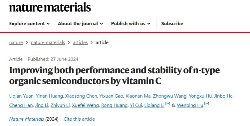 Liqian Yuan#, Yinan Huang#, Xiaosong Chen#, Yixuan Gao, Xiaonan Ma, Zhongwu Wang, Yongxu Hu, Jinbo He, Cheng Han, Jing Li, Zhiyun Li, Xuefei Weng, Rong Huang, Yi Cui, Liqiang Li* and Wenping Hu*,Improving both performance and stability of n-type organic semiconductors by vitamin C,