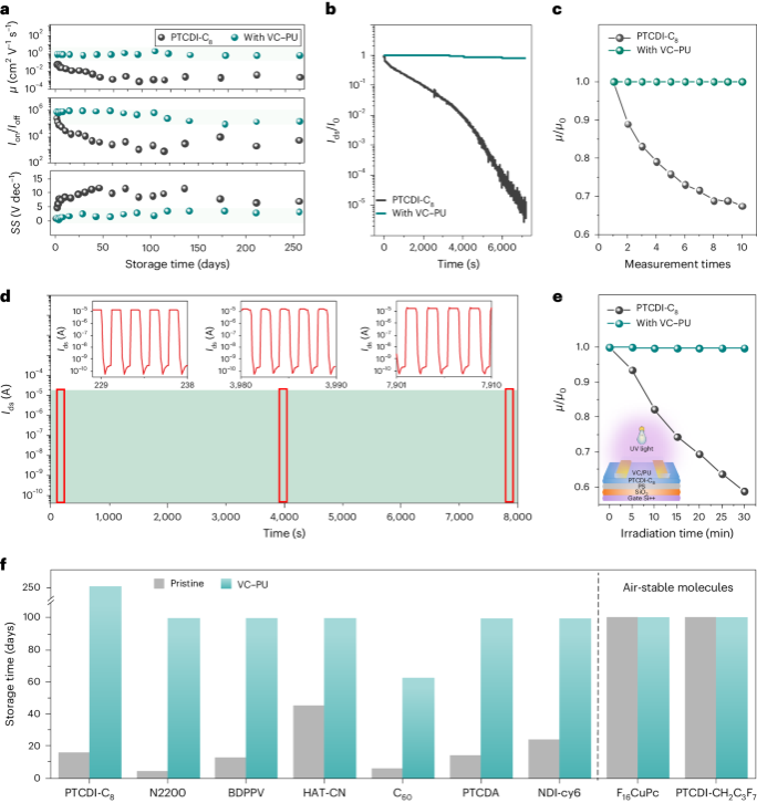 图3 VC提升n型有机半导体器件稳定性。(a)在环境条件下,VC-PU处理前后PTCDI-C8 OFET的性能参数随存储时间的变化。(b)VC-PU处理前后PTCDI-C8 OFET的偏置应力曲线。(c)VC-PU处理前后PTCDI-C8 OFET的归一化迁移率随测试次数的变化曲线。(d)VC-PU处理的PTCDI-C8 OFET在Vds = 60 V和Vgs在60 V ~ 0 V之间切换时的开关循环曲线。插图是循环测试开始、中间和最后阶段的曲线放大图。(e)VC-PU处理前后PTCDI-C8 OFET的归一化迁移率随辐照时间的变化曲线。辐照光源是功率密度为15 mW cm-2的汞灯。(f)VC-PU处理前后不同有机半导体器件的有效保存时间。有效保存时间被定义为器件迁移率降低80%时的保存时间