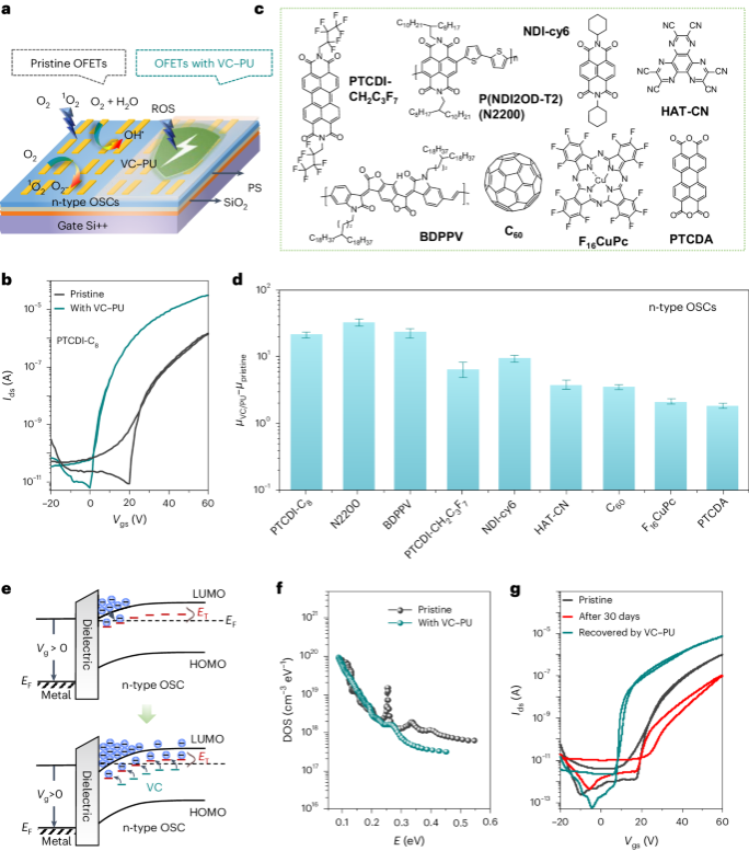图2 VC提升n型有机半导体器件性能。(a)VC-PU处理前后的有机场效应晶体管(OFET)结构示意图。(b)VC-PU处理前后的PTCDI-C8 OFET的转移曲线。Vds = 60 V。(c)本研究所采用的其余8种有机半导体的分子式。(d)9种典型n型有机半导体经VC-PU处理后的迁移率增幅。所有测试均在环境条件下进行。(e)VC钝化OFET中电子陷阱的示意图。(f)用FET法提取VC-PU处理前后PTCDI-C8 OFET的态密度分布(DOS)。横坐标E表示从某能级到LUMO能级的能量。(g)在环境条件下储存30天后OFET性能明显衰退,经VC-PU处理后其性能恢复