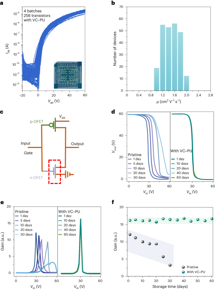 图4 VC抗氧化策略在OFET阵列及逻辑电路元件中的应用。(a)四批OFET阵列中的256个PTCDI-C8晶体管经VC-PU处理后的转移曲线。插图是8 × 8晶体管阵列的光学图像。(b)VC-PU处理后256个晶体管的迁移率(µvc/pu)分布直方图。(c)有机互补反相器的原理图。红色虚线框是指VC-PU处理后的n型OFET部分。(d)当Vdd = 60 V时,VC-PU处理前后反相器的静态电压转移曲线和(e)增益值。(f)VC-PU处理前后器件的增益值随时间的变化图