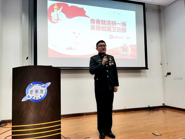 课程第一讲,由个人“三等功”退役士兵、马克思主义学院硕士研究生霍亮为同学们带来题为《青春就该拼一场,衷报祖国守边疆》的主题报告。第一次决定入伍当兵,第一天来到部队,第一次整理内务,第一次紧急集合……霍亮用一段段亲身经历,向同学们展示了军人钢铁般的毅力与永不服输的精神。