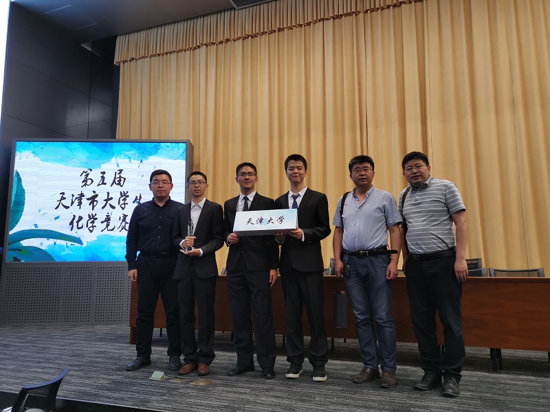 在后续的团体赛中,由理学院马骁飞担任带队老师,理学院赵温涛与赵鹏老师担任指导教师,团队学生成员包括中杜旭朝(2016级应用化学)、李骁(2016级材料科学与工程专业)、杨家宁(2016级化学工程与工艺),这三位同学均在前期化学竞赛理论知识个人赛中获得一等奖,这支队伍是理工结合具有天大特色的团队,经过与其他17所天津高校的激烈角逐所,最终以总分数第一的成绩在团体赛决赛中蝉联团体赛一等奖。