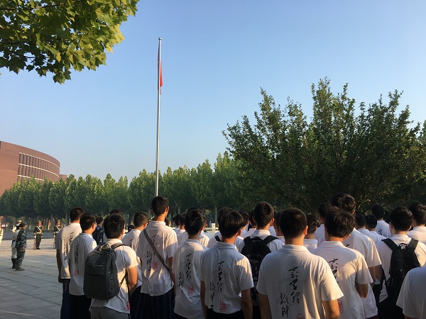 伴着清晨的阳光,理学院本科新生整装待发,观看升旗仪式。仪式在主持人嘹亮的声音中开始,随着国旗护卫队的口号声响起,理学院的同学们个个屏气凝神,默默注视着国旗护卫队的同学们护送国旗入场,国歌奏起,国旗飘扬。天空一碧如洗,绿树红墙下国旗缓缓上升,同学们动情地唱着国歌,行注目礼。这一天,151名新生们在国旗下以青春的名义宣誓,立志成才,报效祖国!