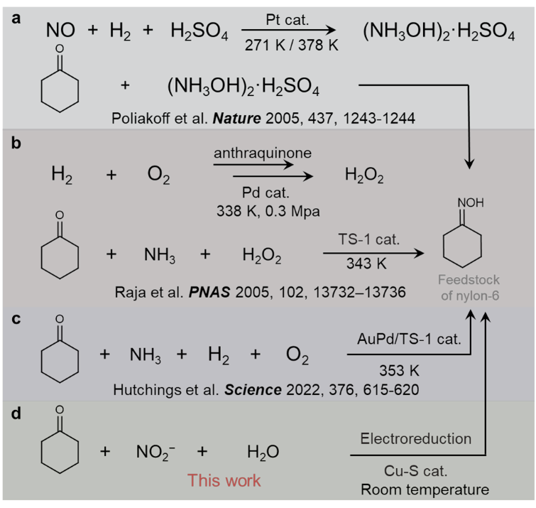 尼龙-6作为尼龙材料最主要产品之一,被广泛用于尼龙纤维、工程塑料和薄膜等行业。环己酮肟是合成尼龙-6的重要前体。目前,全球90%以上的环己酮肟是通过传统的环己酮-羟胺法生产的(图1a)。但是该方法需要使用危险的氢气和腐蚀性的硫酸,存在安全、成本和环境等问题。因此,研究者致力于发展环己酮肟的替代生产策略。