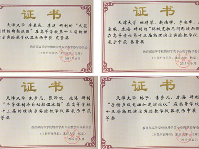 2017年6月23日至6月25日,由全国高等学校物理演示实验教学研究会主办,北京工业大学承办的《第十三届高等学校物理演示实验教学研讨会》在北京工业大学举行。我中心教师庞海带领多名二年级本科学生参加了会议,并携带四件自制仪器参与了交流与评比。参会人员为庞海、朱步凡、张泽欢、李凌峰,共有4件仪器参加了展览与评比,分别为《半导体制冷自动控温冰箱》、《手持多级电磁加速演示仪》、《火花间隙特斯拉线圈》和《铝板克拉尼图形演示》。参展仪器分别获得两项二等奖和两项三等奖,此次参展是我中心首次参展,这是近年来中心开展学生创新活动的成果体现。