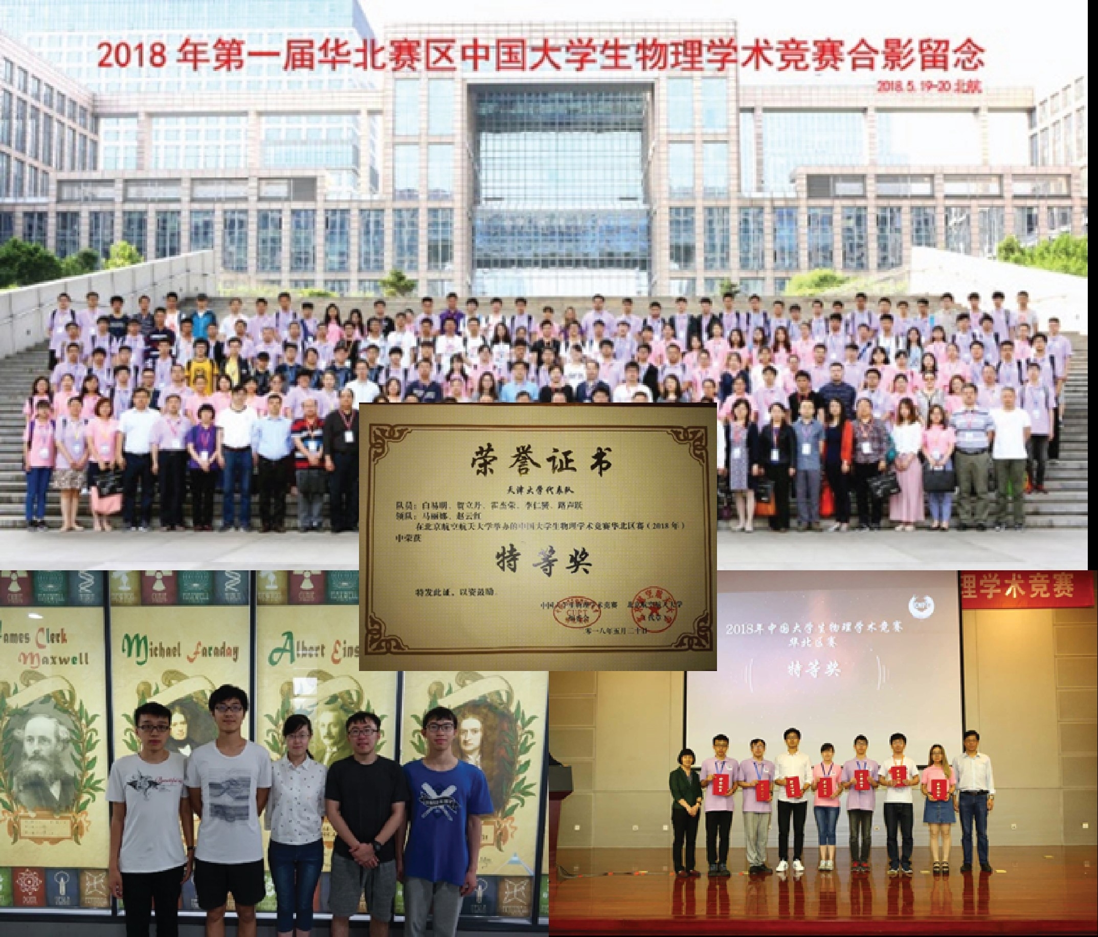 2018年5月19日,2018第一届华北赛区中国大学生物理学术竞赛在北京航空航天大学开幕。本届竞赛由来自华北赛区的17所院校的18支代表队参赛,另有包括国赛总决赛主办方在内的3所高校观摩。天津大学2018CUPT代表队在本项竞赛中荣获特等奖第一名的好成绩。