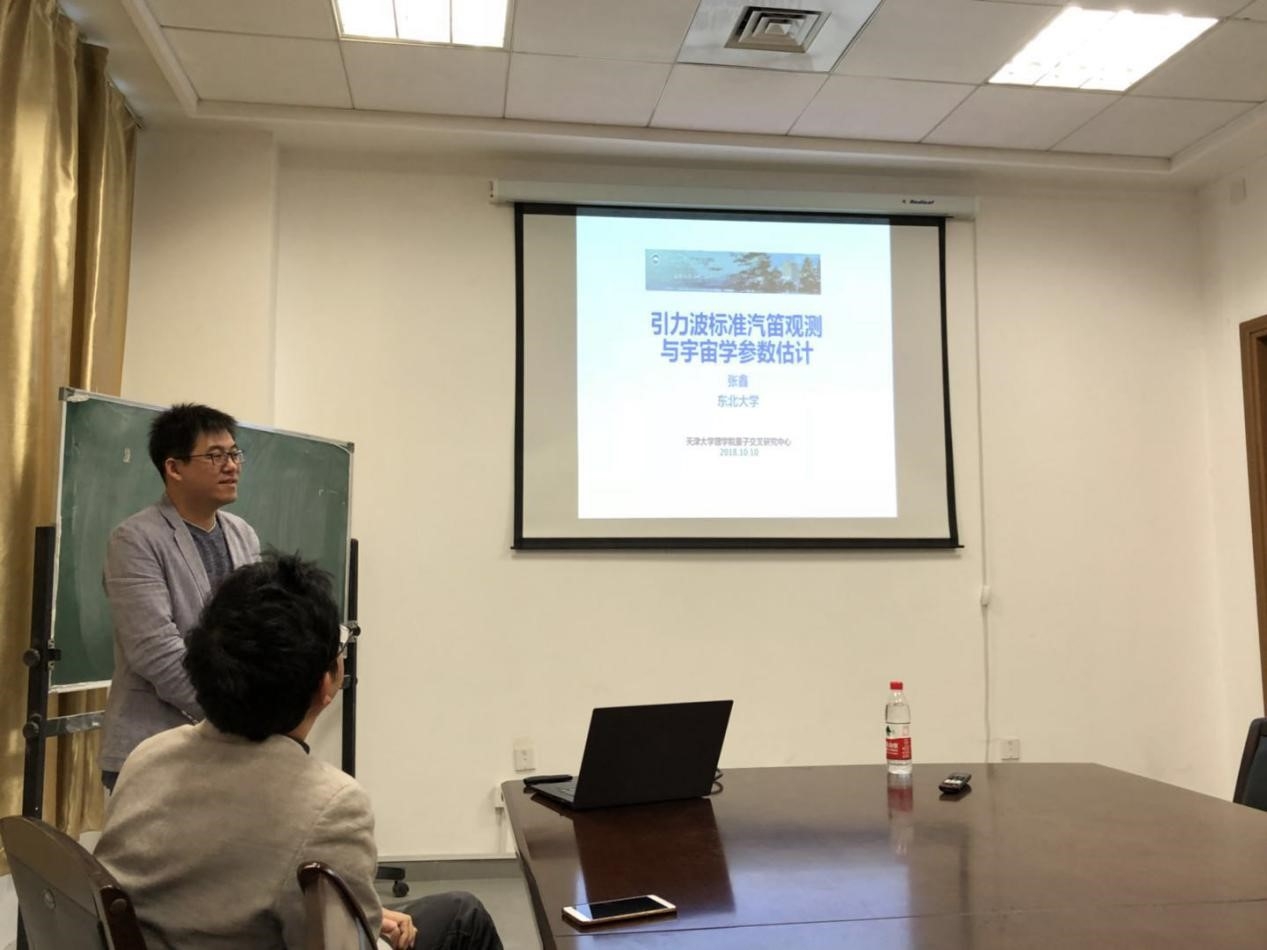 2018年10月10日下午,应天津大学量子交叉研究中心吕宏教授、吴俊宝教授的邀请,东北大学张鑫教授来我系进行学术交流,并在32教学楼256教室做了题为《引力波标准汽笛观测与宇宙学参数估计》的学术报告。