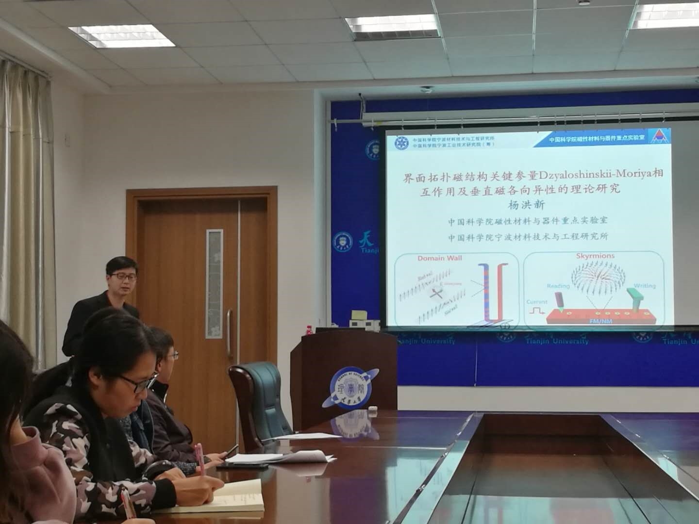 10月22日下午,在32教学楼218教室,理学院物理系邀请宁波材料所杨洪新研究员为物理系师生做题为“First-principles study of Dzyaloshinskii-MoriyaInteraction”的前沿报告。杨洪新研究员,中国科学院宁波材料技术与工程研究所研究员,博士生导师,中国科学院磁性材料与器件重点实验室副主任。研究兴趣主要集中在表面界面自旋电子学的理论计算研究。报告主要结合物理学前沿,介绍了在铁磁金属与氧化物界面自旋电子学,5d和3d金属界面的自旋轨道电子学,自旋霍尔效应以及石墨烯自旋电子学等领域的内容。最后,杨老师希望大家都能在年轻的时候,努力学习,在科学中做出自己的贡献。