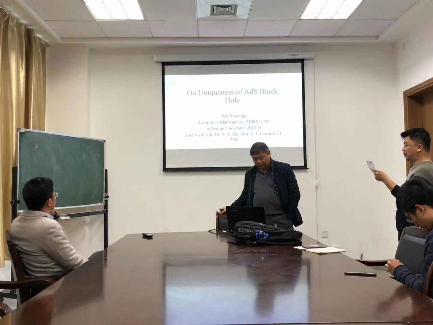 2018年11月1日下午,应天津大学量子交叉研究中心吕宏教授、吴俊宝教授的邀请,中科院数学与系统科学研究院数学所吴小宁教授来我系进行学术交流,并在32教学楼256教室做了题为On Uniqueness of AdS Black Hole的学术报告。报告会由量子交叉研究中心吴俊宝教授主持。