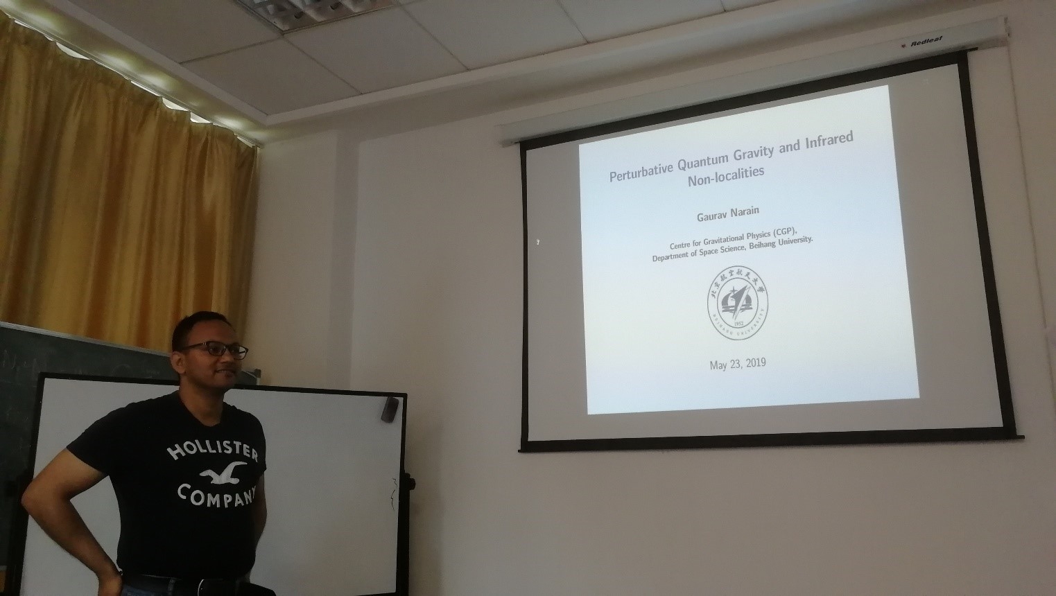 2019年5月23日上午,应天津大学量子交叉研究中心吴俊宝教授的邀请,北京航空航天大学Gaurav Narain博士来我系进行学术交流,并在32教学楼256教室做了题为Perturbative Quantum Gravityand infrared non-localities的学术报告。