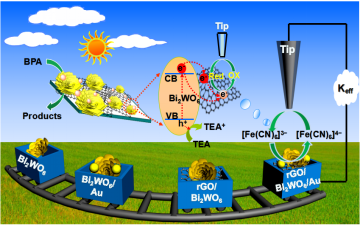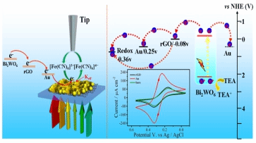 近日,天津大学理学院化学系的卢小泉教授课题组通过水热法和光还原的方法,理性设计了具有多步电子转移行为的rGO/Bi2WO6/Au三元体系。该三元复合材料较二元体系和本体材料表现出高的光电催化活性,这主要归因于"Cascade System"下的多步电子转移行为有效的促进了光生载流子的分离,即在可见光的照射下,钨酸铋导带的电子会很快的转移给石墨烯再进一步转移给金纳米颗粒或直接转移给金纳米颗粒形成一个多步的电子转移路径,而多步的电子转移行为有效的抑制了光生电子和空穴对的复合。同时,该课题组又利用自行搭建的紫外-可见扫描电化学显微镜(UV-vis/SECM)平台从微界面的角度原位表征了各种材料微界面电子转移的动力学参数,发现三元复合材料(rGO/Bi2WO6/Au)较二元复合材料(Bi2WO6/Au,rGO/Bi2WO6)和本体材料(Bi2WO6)表现出较快的界面电子转移行为,且三元复合材料(rGO/Bi2WO6/Au)的界面电子转移速率常数是本体材料(Bi2WO6)的1.6倍。这项工作不仅为有效的提升光/电催化体系性能的研究提供了新的见解,而且为设计高效的光催化CO2还原的催化剂提供了思路,本工作以通讯论文形式发表在Small上。