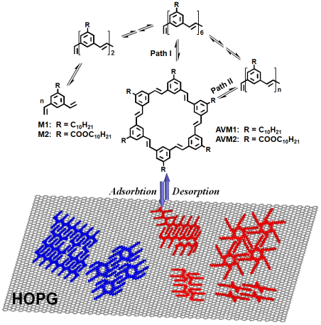 最近,天津大学理学院分子光电科学市重点实验室雷圣宾教授(Prof. Shengbin Lei)课题组和美国University of Colorado Boulder张伟教授(Prof. Wei Zhang)课题组合作在《Angew. Chem. Int. Ed.》上发表了题为《Surface-Confined Dynamic Covalent System Driven by Olefin Metathesis》的研究成果。作者采用1,3-二乙烯基-6-癸基苯(M1,R = C10H21)和1,3-二乙烯基-6-癸基苯甲酸酯(M2,R = COOC10H21)为反应前体分子,利用扫描隧道显微镜(scanning tunneling microscopy,STM)的原子级分辨率、以平整的高定向热解石墨(HOPG)为反应基底,研究了表面限域作用对烯烃复分解反应及环化过程的影响,以及反应温度、取代基和环境压力对产物分布的影响。烯烃复分解反应能够在溶液相中和界面上同时进行,通过线性六聚体的环化可以形成六聚大环(path I),同样更长的线性聚合物也可以通过回咬(backbiting)形成大环(path II)。研究结果表明,二烯单体在低温下生成寡聚物,分子链的长度会随着反应温度的升高而增长,最终生成热力学最稳定的六聚大环。单体和中间产物在HOPG表面的吸附和组装会极大降低被吸附物的平移和自由旋转能力,从而大大改变动态反应体系中的产物分布。假如其中一种产物在某一反应条件下能在HOPG表面形成稳定的组装结构,说明该产物在HOPG表面具有很强的亲和力,从而导致该产物在表面的扩增。因此,表面对产物的选择性吸附可以使得某种特定产物被放大,通过利用表面限域作用得到特定的中间产物,如二聚体。通过STM在HOPG表面上直接地观察到了动态烯烃复分解反应体系的结构变化,为烯烃复分解反应的反应机理提供了直接证据。这种表面限定的动态体系为表面支撑的不同寻常的分子组装和网格结构的发展提供了有趣的新方法。