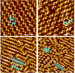 图1.M1在低真空条件下表面限域烯烃复分解反应产物的STM高分辨图像,(a) 35 °C反应18小时 (b), 60 °C,18小时 (c), 100 °C,16小时 (d) 150 °C,15小时。Scale bars: 5 nm。