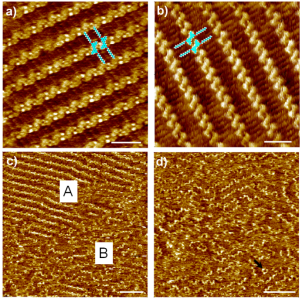 图 2.M2在低真空条件下表面限域烯烃复分解反应产物的STM高分辨图像,(a), (b) 35 °C反应18小时; (c) 100 °C,16小时; and (d) 150 °C,15小时。Scale bars: (a, b)3 nm, (c,d) 10 nm.