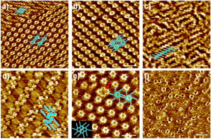 图3.非表面限域条件下M1和M2烯烃复分解反应产物的STM图像:M1在a) 35 °C反应18小时;b) 60 °C,18小时;c) 150 °C,15小时;M2在 d) 35 °C反应18小时; e) 100 °C,16小时;f) 150 °C,15小时。Scale bars: (a-c,e,f)5 nm, (d) 3 nm.