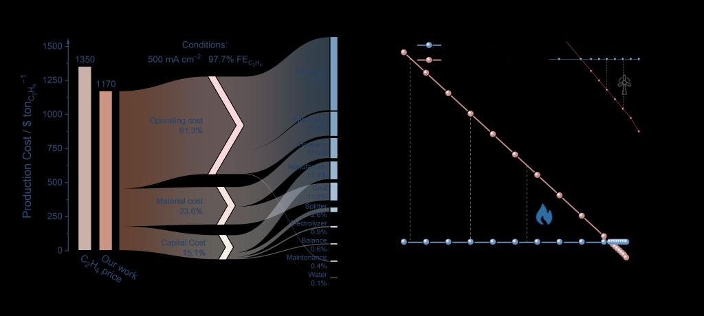 There are problems of high-dependence on petroleum, high energy consumption and high carbon emissions in the production of traditional ethylene. Nevertheless, China is rich in coal resources which enables the production of ethylene based on electrocatalytic semi-hydrogenation with coals as the carbon source. Such strategy deserves development since it conforms to national conditions and is expected to produce ethylene by recycling coals. However, given severe competitions for hydrogen evolution and the lack of economic and technological analysis, this strategy’s profitability is still unclear which together restrict the development of this strategy.
