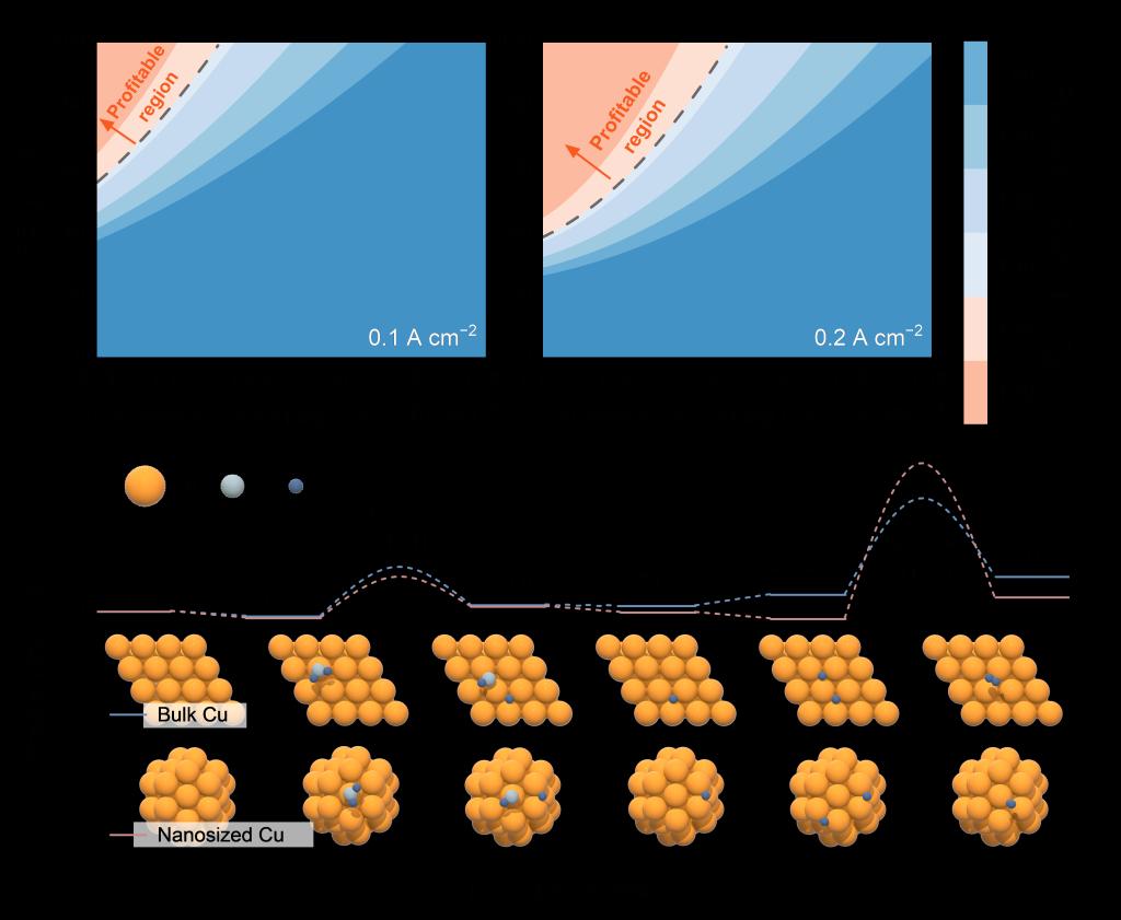 To promote the practical application of this strategy, the team led by Professor Zhang Bing firstly set profitable targets from economic and technological analysis and revealed that the key to profit is to curb the competition between ethylene perhydrogenation and hydrogen evolution reaction at an industrially relevant current density. Economic and technological analysis has shown that this strategy is profitable only if the current density is larger than 0.2 A cm-1 and the Faraday efficiency is larger than 85%. Based on this, they meticulously designed the catalyst: (1) a Cu catalyst with weak ethylene adsorption was chosen to curb the competition for perhydrogenation and enhance ethylene selectivity; (2) theoretical calculations confirmed that the small size of Cu not only promoted the activation of water but also increased the energy barrier of the hydrogen evolution reaction (Figure 2b), thus improving the Faraday efficiency of ethylene.