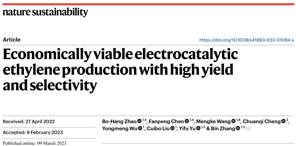 Recently, a research team led by Professor Zhang Bing from the School of Science, Tianjin University has made progress in the research of coal-derived acetylene based electrocatalytic semi-hydrogenation for ethylene production. The research results have been published in the Nature subjournal- Nature Sustainability (Figure 1) under the title "Economically viable electrocatalytic ethylene production with high yield and selectivity" with the School of Science, Tianjin University as the first correspondent.