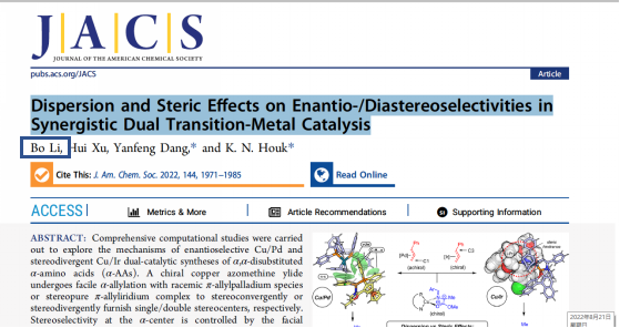 The corresponding author is Dang Yanfeng from the School of Science, Tianjin University, and Prof K.N.Houk from UCLA. The lead author is Li Bo, an undergraduate of Applied Chemistry, Grade 2017. Tianjin University is the first communication unit. Under Dang Yanfeng’s guidance, Li Bo also published an academic paper as lead author inACS Catalysis(2021, 11, 6816-6824, and published an academic paper inChemical Science(2022, 13, 4801-4812)as the co-first author.