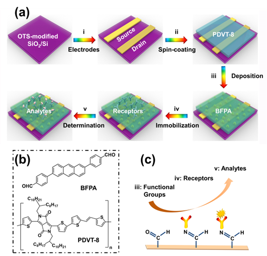 Figure. Schematic representation of OFET-based biosensors. (a) Fabrication of OFET-based biosensors. (i) Au source and drain electrodes are deposited on OTS-modified SiO2/Si substrates; (ii) PDVT-8 film is spin-coated as a charge transport layer; (iii) BFPA functional layer is modified on the device; (iv-v) AFP antibodies are immobilized to form the receptor layer for the determination of target AFP biomarkers. (b) Chemical structure of the organic molecules (BFPA and PDVT-8). (c) Schematics showing surface modification to immobilize antibodies as receptors for the determination of target AFP biomarkers.