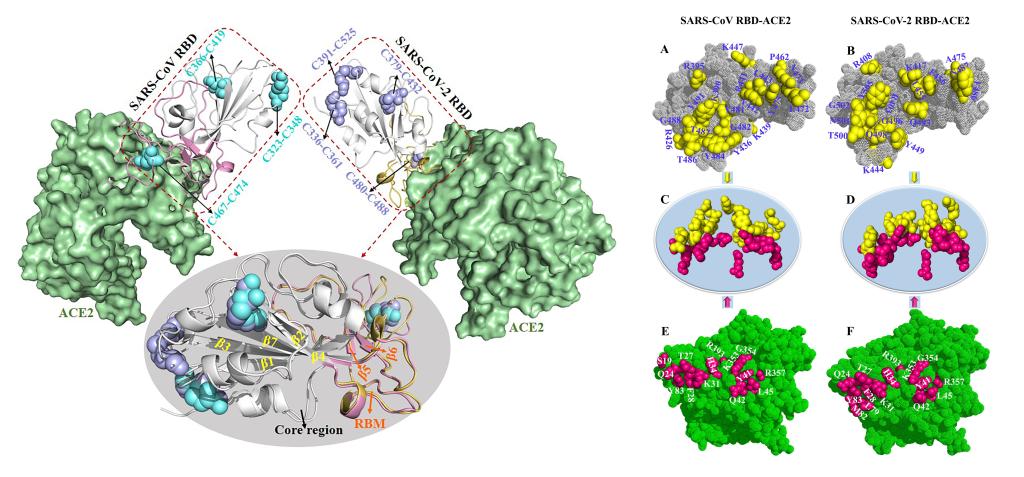 The successful cell invasion either by SARS viruses or by COVID-19 depends primarily on protein-protein interactions between the binding domain (RBD) of the hedgehog protein (S protein) and the human ligand angiotensin-converting enzyme 2 (ACE2) (the associated structure is shown on the left of the figure below).