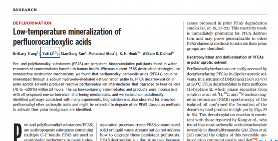 This study is devoted to addressing the PFAS contamination problem under mild reaction conditions. By studying the reaction mechanism, Li Yuli proposed a reaction mechanism that could be consistent with the experiment and tested it by calculation. This study realized that perfluoroalkyl carboxylic acid (PFCAs) can be mineralized by a sodium hydroxide-mediated defluorination pathway, and that PFCAs will spontaneously decompose into benign inorganic fluoride ions and simple pollution-free organic molecules, which can provide the most direct and effective theoretical and practical guidance for the treatment of PFCs pollution and make a great contribution to the development of environmental chemistry.