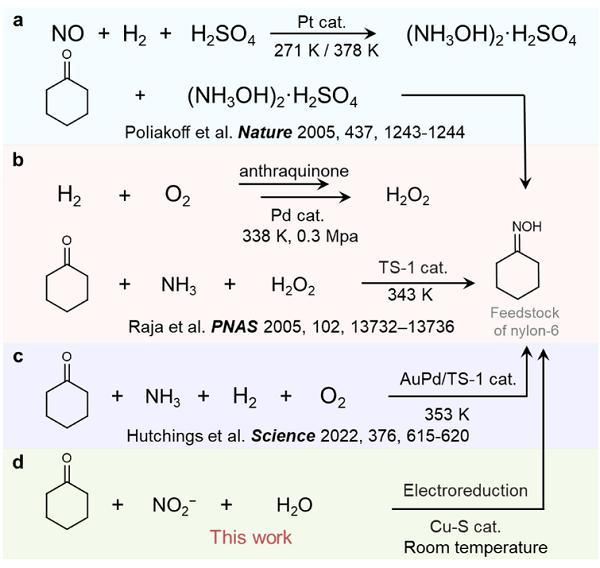 As one of the essential products of nylon materials, nylon-6 is widely used in the nylon fiber, engineering plastics and film industries. Cyclohexanone oxime is an important precursor for the synthesis of nylon-6, and more than 90% of it is produced by the traditional cyclohexane-hydroxylamine method (Figure 1a) in the world. However, this method needs hazardous hydrogen and corrosive sulphuric acid, which have potential risks including hidden danger, high costs and environmental pollution. Researchers have therefore worked to develop alternative production strategies for cyclohexanone oxime.